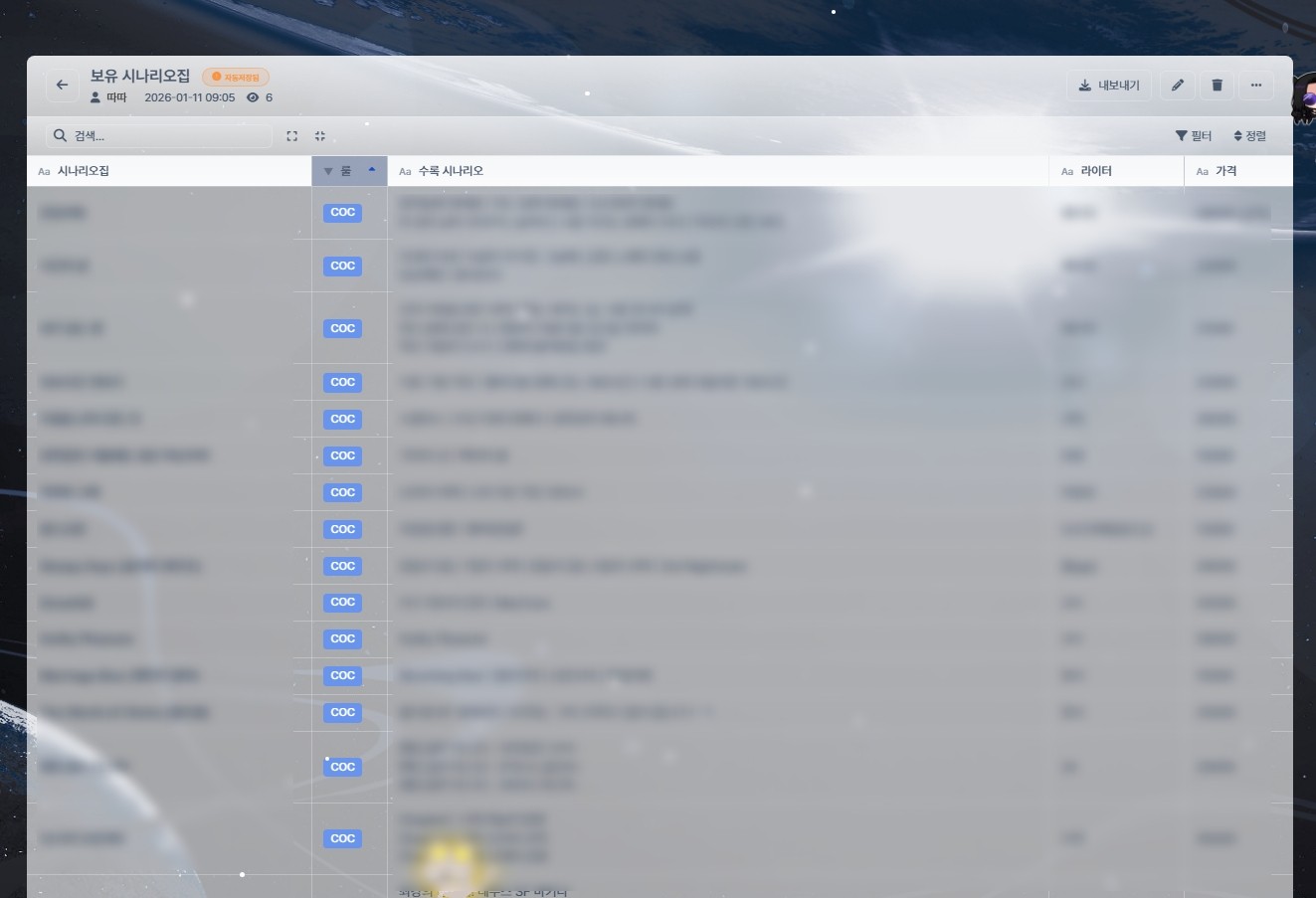 원래는 그냥 타임라인 게시판으로 메모처럼 쓰고 있었거든요. 근데? 생각해보니 테이블 게시판도 나왔고 보니까 딱 무언가 백업정리하기 좋아보이더라고요. 그래서 호다닥 샀는데 진심 한눈에 보기도 좋고 뭘 썼는지, 이건 있는지 검색하기에 너무 짱이었어요.