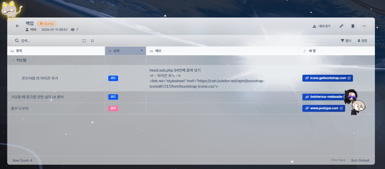 게다가 백업하고 싶은 것도 많은데 매번 게시판 추가할 필요없이 테이블을 하나 더 추가하면 되니까... 진심...진심 너무 좋아요!!!!!!!!!!!!!!!!!!!! 시날집도 노션에다가 대충 낑겨박은거 드디어 한곳에 정리할 수 있게 됏네요. 다들 꼭 하나 장만하세요....