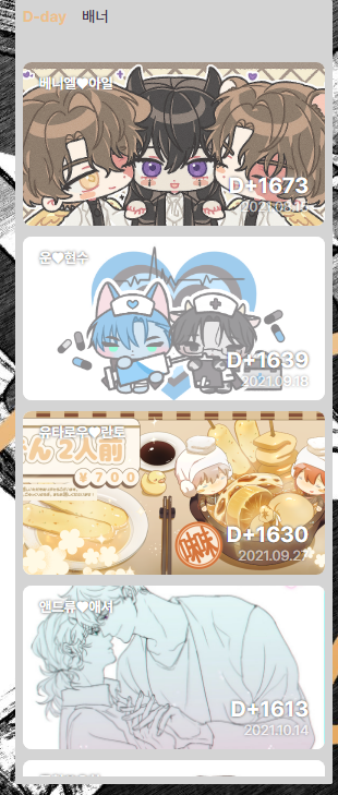 TMI지만 저는 갠홈이 아니라 2인 홈페이지입니다. 아무튼 그만큼 수많은 디데이가 존재하는데, 42개의 기념일(성사일+캐릭터1의 생일+캐릭터2의 생일)을 모두 정리할 수 있는 간편한 디데이 페이지가 도움이 되었습니다.